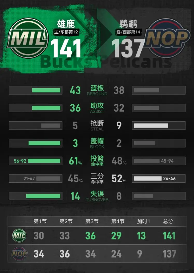 全场具体比分(雄鹿队在后):34-30、36-33、34-36、24-29、9-13。