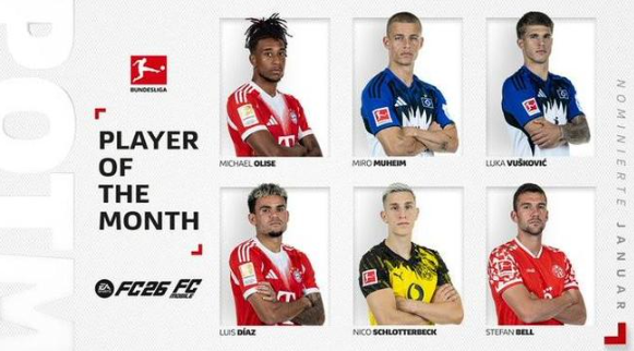 时间:2026-02-05 16:23:23北京时间2月4日,德甲1月最佳球员候选名单公布,这6名球员为奥利塞、穆海姆、武什科维奇、迪亚斯、施洛特贝克、斯特凡-贝尔.