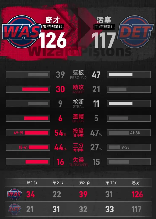 时间:2026-02-06 10:48:07北京时间2月6日NBA常规赛,客场作战的奇才以126-117击败活塞。莱利20分6篮板5助攻,霍兰二世11分10篮板2助攻。