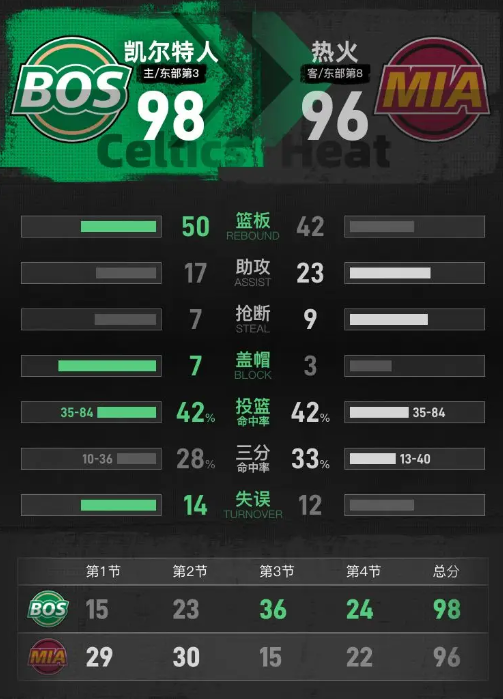 全场具体比分(凯尔特人队在后):29-15、30-23、15-36、22-24。