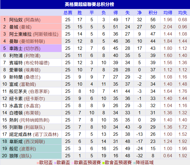 英超积分榜:阿森纳仍6分领跑,利物浦已落后前五4分