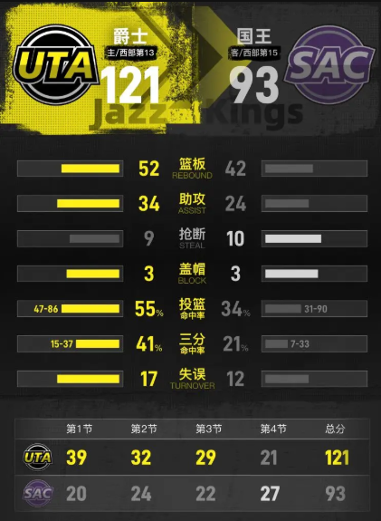 第四节,爵士在开局展现出良好状态,迅速将领先优势扩大至36分。国王虽然进行反击,将分差缩小至26分,但爵士的进攻节奏稳定,始终控制着比赛节奏,最终再次拉开分差。比赛结束时,爵士以121-93赢得胜利。