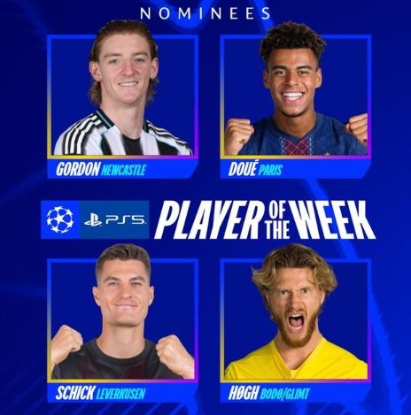 北京时间2月19日,欧冠官方公布了淘汰赛附加赛首回合最佳球员候选名单,这4名球员为戈登、杜埃、希克、卡斯帕-霍。