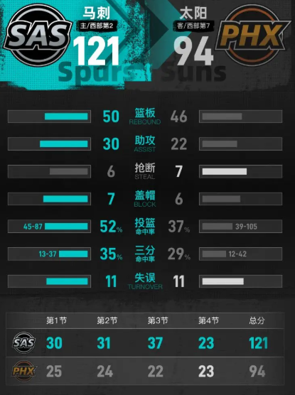最后一节,马刺继续保持良好状态,开局便发动攻击,将优势扩大至32分。太阳在中段发起反击,将分差缩小至22分,但马刺及时调整,保持稳定的进攻节奏,逐渐再次拉开了比分差距。最终,第四节结束时,马刺以121-94赢得比赛。