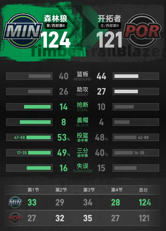 第四节,开拓者攻击力十足,开局便以102-101反超。随即,森林狼加强进攻,迅速追平并将领先优势扩大至9分。在小节后段,开拓者再次展开追分。最终,森林狼以124-121赢得比赛。