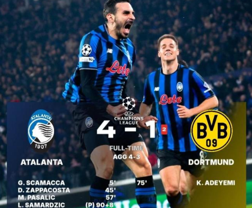 赛后根据统计,此次翻盘多特蒙德也让亚特兰大成为了自2018-19赛季利物浦半决赛逆转巴塞罗那以来,欧冠赛场上第一支在淘汰赛阶段首回合落后至少两球,最终在次回合完成翻盘的球队。