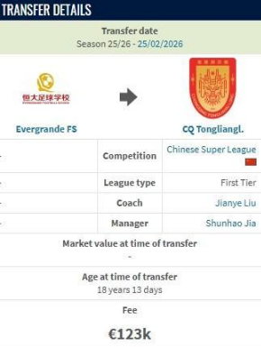 德转显示,重庆铜梁龙从恒大足球学校签下刘佳乐花费12.3万欧元,约100万人民币。