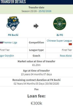 德转显示,浙江队新援瓜里拉帕的租借费为30万欧。