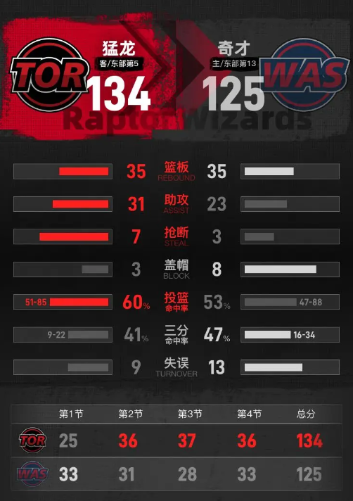 全场具体比分(奇才队在后):25-33、36-31、37-28、36-33。