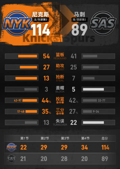 第四节,尼克斯开局手感不佳,分差一度缩小至9分。但随着比赛的进行,尼克斯逐渐找回状态,迅速打出一波进攻,将领先优势扩大至26分。尽管马刺在小节后段奋力追分,但最终未能逆转。比赛结束时,尼克斯以114-89赢得胜利。