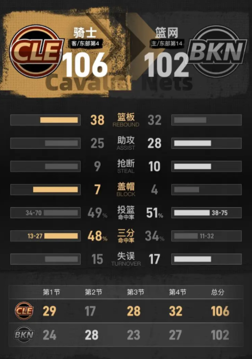 第四节开始,篮网开局再次取得进攻优势,暂时以80-78领先。骑士迅速调整状态,发力反扑,不仅抹平了比分,还将领先优势扩大至9分。随后的比赛中,篮网努力紧追不舍。此节比赛中,篮网的小波特表现出色,获得10分,其中包括2记三分球。最终,骑士以106-102赢得比赛。
