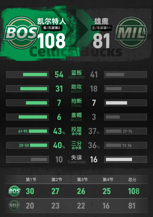 第四节,凯尔特人开始时迅速展开攻击,将分差一度扩大至31分,几乎锁定胜局。尽管雄鹿在小节后段有所回暖,逐渐缩小分差,但凯尔特人表现出色,尤其是普理查德的出色发挥,使得他在本节内拿下12分,其中包括4记三分。最终,凯尔特人以108-81赢得比赛。