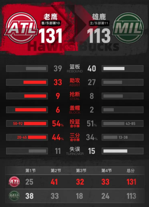 全场具体比分(雄鹿队在后):25-38、41-33、32-18、33-24。
