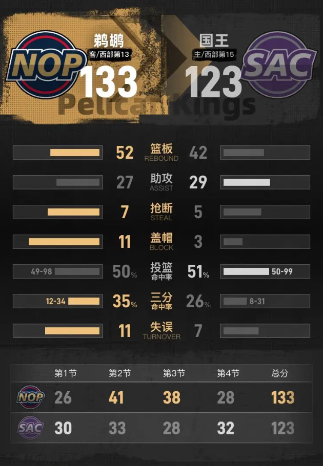 第四节开始后,国王保持追分势头,阿丘瓦、尤班克斯连续在内线得分,一度把分差缩小到8分。鹈鹕依靠威廉森的连续得分稳住局面,后半段琼斯三分命中,墨菲接连命中三分和完成空接扣篮,鹈鹕重新把分差拉到15分。最后阶段阿丘瓦命中三分,蒙克末段跳投得分,鹈鹕客场133-123击败国王。