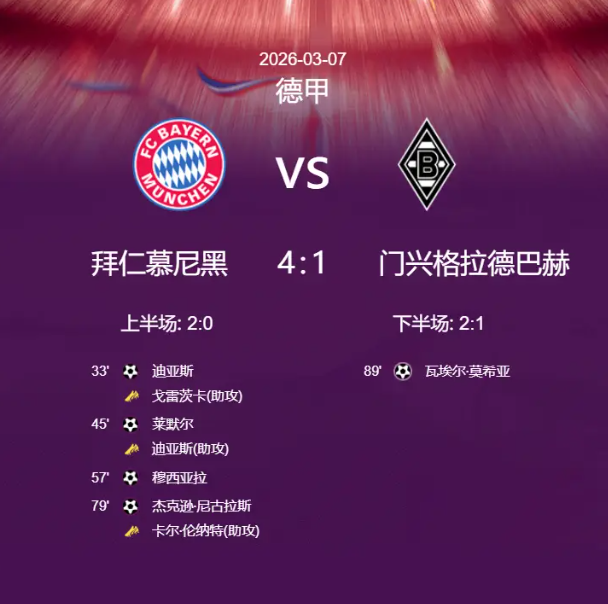 德甲北京时间3月7日03:30,德国足球甲级联赛25/26赛季第25轮,积分榜领头羊拜仁慕尼黑坐镇安联球场迎战门兴格拉德巴赫。上半场拜仁由迪亚斯打破僵局,莱默尔补时阶段再下一城。下半场门兴早早被罚下一人,穆西亚拉点射扩大比分,杰克逊锦上添花,瓦埃尔·莫希亚终场前为门兴扳回一城。最终拜仁慕尼黑4-1战胜门兴格拉德巴赫,先赛的情况下14分领跑积分榜。。