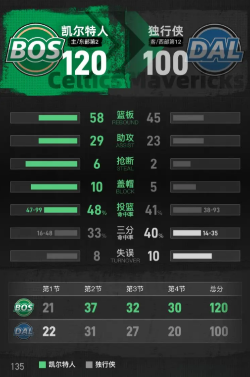 进入第四节比赛,凯尔特人延续进攻状态,普理查德连得4分,豪瑟接到怀特助攻命中三分,分差很快拉开到12分。克塔在内线连续发起冲击,他接连抢到进攻机会,罚球、快攻、空切连续得到8分,凯尔特人很快把分差扩大到20分以上,分差最高达到25分,比赛提前失去悬念。末节后半段凯尔特人换下全部主力,独行侠抓住机会投中三记三分追回一些分数,最终凯尔特人主场120-100击败独行侠。