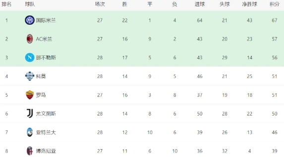 在积分榜上,国际米兰依然遥遥领先,以67分高居榜首,战绩是22胜1平4负。排名第2的是AC米兰,只拿到57分,足足落后10分。显然,意甲的冠军归属基本失去了悬念。卫冕冠军那不勒斯只拿到56分,排名第3。科莫赢球之后,总积分达到51分,升到了第4名。而同样51分的罗马掉到第5名。尤文图斯50分,在争四集团中稍稍落后,排名第6。