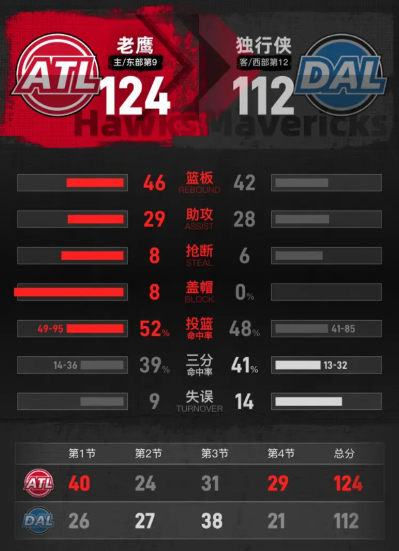 北京时间3月11日NBA常规赛,主场作战的老鹰以124-112击败独行侠,老鹰取得7连胜,独行侠遭遇8连败。奥孔古18分10篮板2助攻,弗拉格14分12篮板5助攻。