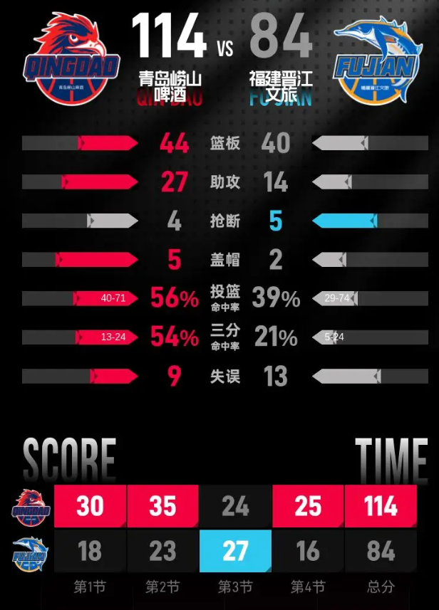 青岛半场多点开花,三分线外发挥出色,领先优势达到24分。福建进攻端稳定性不足,始终没能打出连续得分的攻势缩小分差。