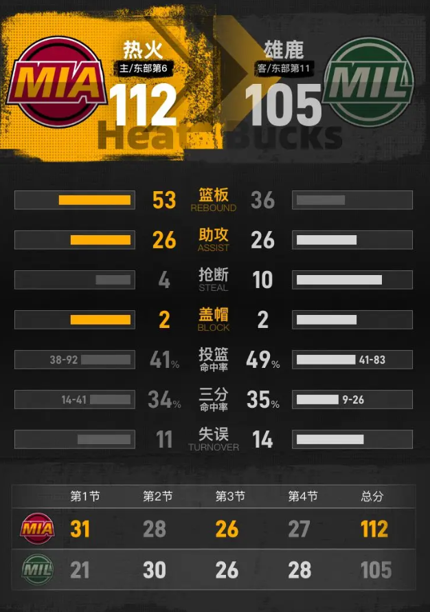 阿德巴约21分字母哥空砍31分 热火胜雄鹿