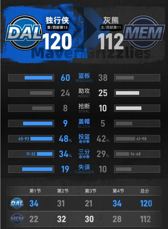 独行侠依靠内线进攻和稳定的外线命中率,上半场一直占据场上主动,灰熊凭借三分火力将分差控制在可追范围内。