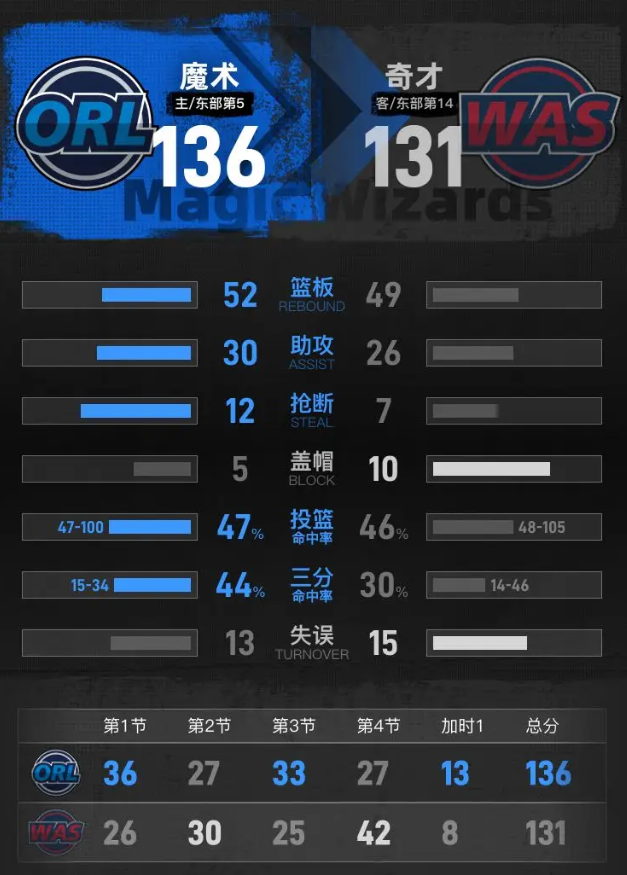全场具体比分(魔术队在后):26-36、30-27、25-33、42-27、8-13。