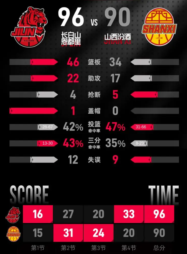 第四节开始后,长白山打出反击高潮,刘雁宇两罚全中,姜伟泽和贾昊接连命中三分,贾昊罚中一球扳平比分。姜伟泽再中三分,威尔逊内线连续得分,长白山反超拿到5分优势。迪亚洛连拿4分,张宁命中三分加罚,把分差缩小到1分。威尔逊回敬三分再两罚全中,重新拉开分差。栾利程连续两次上篮得分,长白山将优势扩大到8分。山西连续追分,张宁、迪亚洛接连得分,最后一分钟把分差缩小到2分。栾利程两罚全中,张宁两罚全中再次追分,姜伟泽跳投得分后再两罚全中,最终长白山恩都里以96-90击败山西汾酒。