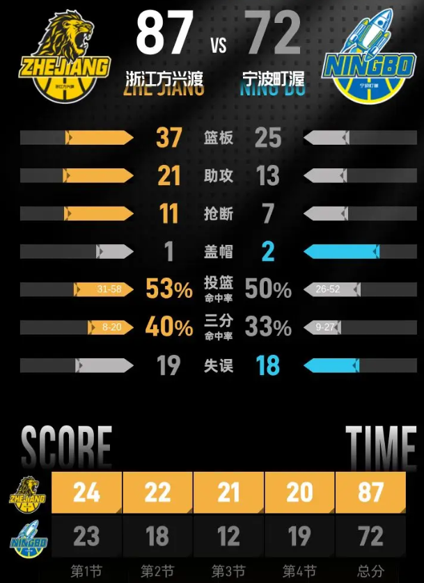 第四节开始后,胡金秋两次内线进攻拿下4分,领先优势扩大到16分,戴昊抛投得分,俞长栋接到助攻命中三分缩小分差,塔克马上命中三分回应。赵嘉仁连续两记三分命中,分差扩大到20分,塔克连续内线得分,分差一度拉开到23分。宁波换下主力球员后依旧积极追分,赵岩昊命中三分稳住局势,后续宁波连续得到8分缩小分差,最终浙江主场收下这场胜利,比分定格为87-72。