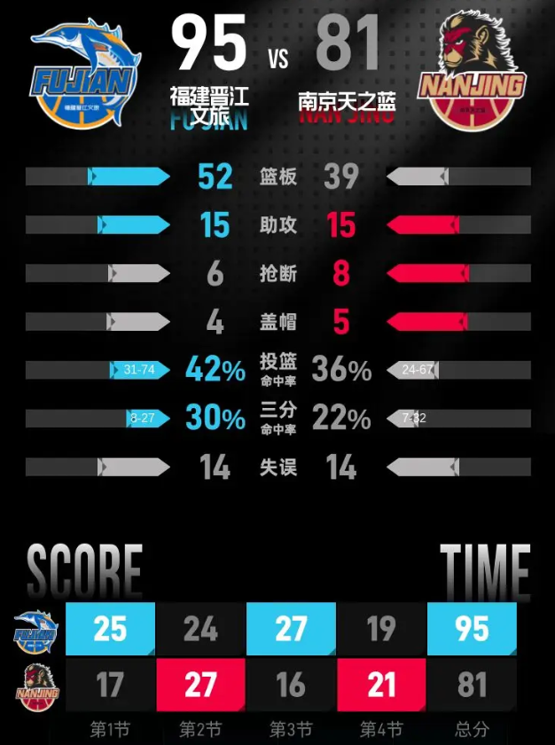 南京天之蓝队:阿科尔·马温24分8篮板、杰伦·汉兹21分8篮板4助攻、阿卜杜赛麦提·买提阿布拉10分7篮板、祝铭震8分1篮板2助攻、帕克·杰克逊-卡特莱特8分2篮板5助攻、布雷迪·马内克5分1篮板、马鑫鑫4分3篮板、李斌卓1分3篮板2助攻、邬挺嘉1篮板2助攻。