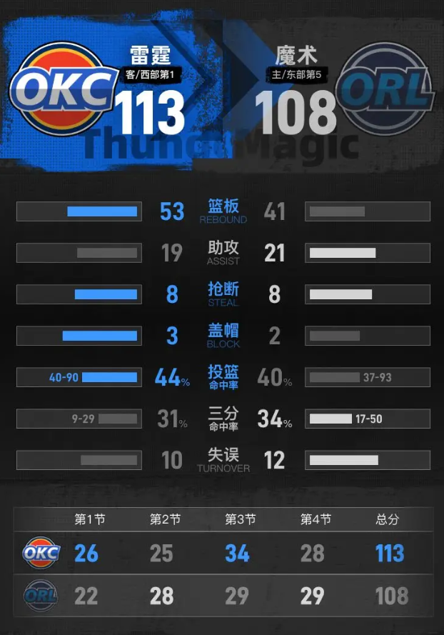 进入第四节比赛,杰文-卡特连续得分,将分差缩小到2分,凯恩和贝恩接连命中三分,魔术90-89实现反超。米切尔连续拿下4分稳住局势,乔命中三分后领先扩大到7分,萨格斯三分回应,贝恩上篮再追两分。亚历山大三分加两罚,卡鲁索快攻上篮得分,雷霆把领先拉开到10分。班凯罗连续突破得分,亚历山大两罚全中后领先保持在10分,最后20秒班凯罗上篮得分,霍姆格伦上篮加罚球,雷霆113-102领先8分。席尔瓦和贝恩接连命中三分,时间走完,最终客场作战的雷霆113-108拿下胜利。