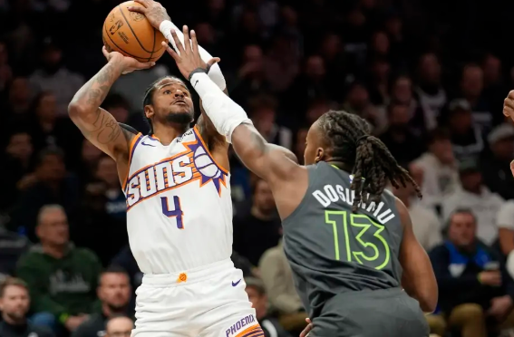 第四节开始后,兰德尔保持火热进攻状态,连续突破得分,半节不到就带领球队打出小高潮,把分差拉开到12分。兰德尔后撤步跳投命中后,分差已经来到15分,多森姆快攻再添两分,森林狼一直保持两位数领先。布克连续通过罚球和突破砍分,古德温突破得手把分差缩小到9分,兰德尔两罚全中稳住局势,海兰德罚中一球,最终森林狼主场116-104击败太阳。