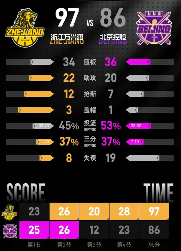 进入第四节,朱松玮跳投先拿两分,朱俊龙接助攻三分命中,赵嘉仁上篮得分,浙江延续优势,朱俊龙再中三分将分差拉开到12分。杜伯超连续两次内线得分缩小分差,里勒三分命中、杜伯超上篮得分,北控把分差缩小到6分。浙江外线接连发炮,赵嘉仁三分、朱俊龙三分稳稳命中,分差再次回到两位数。最后阶段浙江稳稳把控局势,胡金秋两罚全中后浙江97-82领先,朱松玮和豪斯末段各得两分,最终浙江以97-86击败北控。
