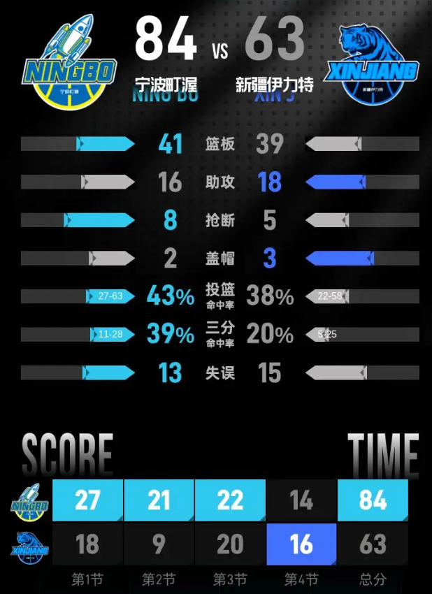宁波半场已经建立起21分的领先优势,新疆进攻端效率低迷,单节只拿到9分,早早陷入大比分被动。