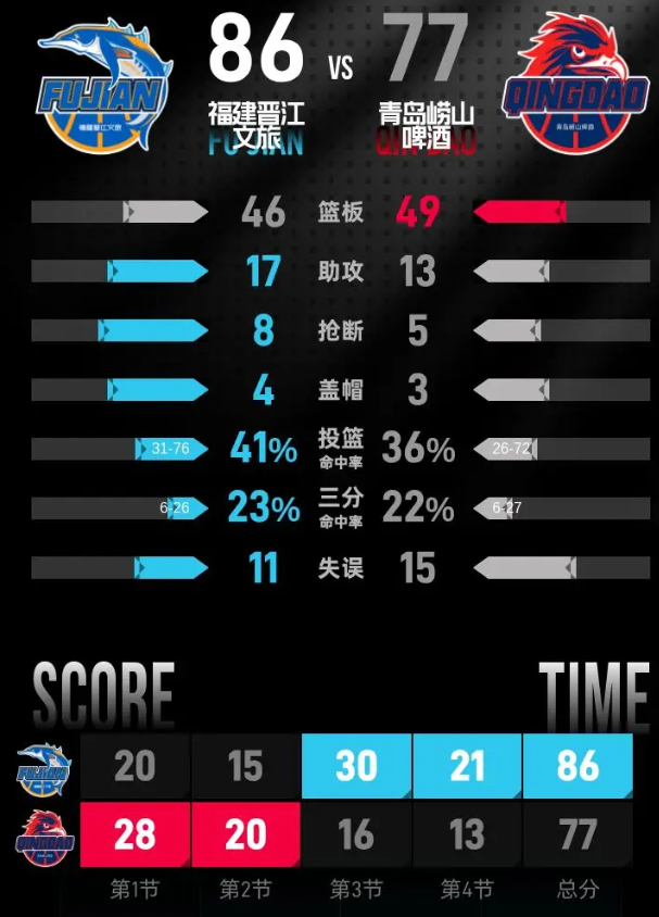 进入第四节,福建延续进攻状态,邹阳、黎伊扬轮流得分,稳步扩大领先优势。皮特森再中三分将分差拉开到8分,福建多次通过罚球进一步扩大优势,领先达到10分。青岛接连打出反击,王睿泽、米奇接连得分缩小分差,林韦恺两罚全中把分差缩小到8分,皮特森罚中一球后比分锁定为86-77,福建主场拿下胜利。