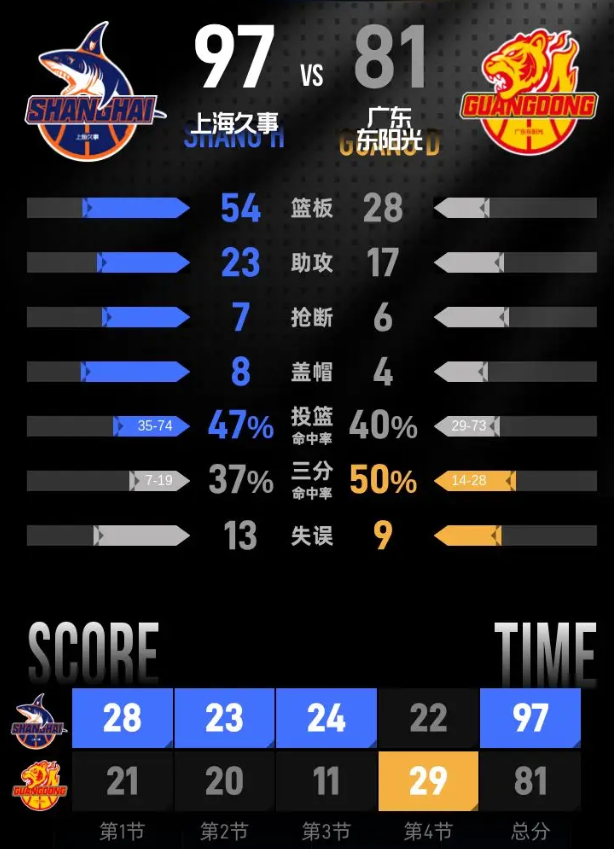进入第四节比赛,古德温先上篮得分,徐杰和崔永熙先后命中三分,广东发起反扑,将分差缩小到20分。怀特塞德灌篮得分,李弘权上篮打进,胡明轩和徐杰再中三分,分差缩小到18分。上海稳扎稳打,刘铮、李添荣接连得分,刘铮两罚全中后分差回到26分。广东外线保持手感,连续命中三分,崔永熙、王洪泽先后得分,将分差缩小到16分。李弘权命中三分稳住局势,徐杰再中三分,李添荣接到助攻命中三分,最后徐杰再进一记三分,全场比赛结束,上海久事97-81击败广东东阳光。