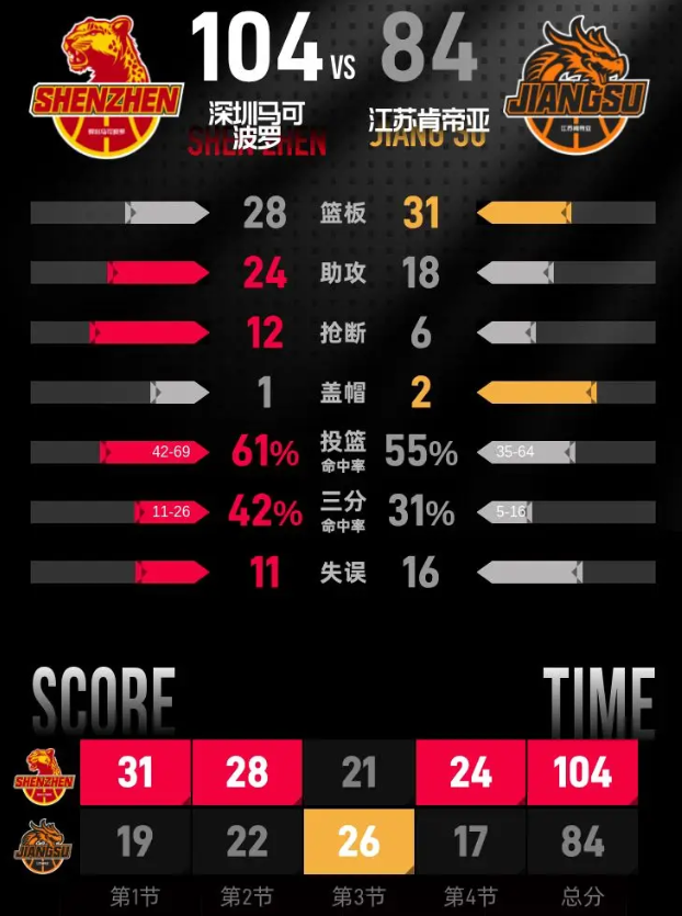进入第四节比赛,贺希宁抛投得分打开局面,蒋浩然、斯塔克斯连续得分缩小分差,周鹏命中三分稳住优势。之后双方你来我往,分差始终维持在10分以上。贺希宁命中三分后,史密斯连拿5分,其中包括一记三分,分差重新回到20分。王浩然接周鹏助攻命中三分,分差扩大到21分,江苏队换下全部主力,比赛进入垃圾时间。终场前容子峰命中三分,贾尔斯最后跳投得分,最终深圳马可波罗以104-84击败江苏肯帝亚。