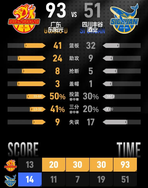 全场具体比分(广东东阳光队在后):14-13、11-20、7-30、19-30。