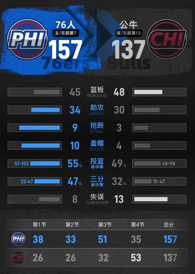 比赛进入末节,双方换上部分替补阵容,公牛替补进攻状态不俗,开局接连取分。乔治继续开火连拿8分,分差一度扩大到47分。公牛延续火力,塞克斯顿、迪林厄姆轮流得分,米勒也接连取分,不断缩小分差。最后时刻洛瑞命中三分,米勒两罚全中,最终主场作战的76人以157-137击败公牛。