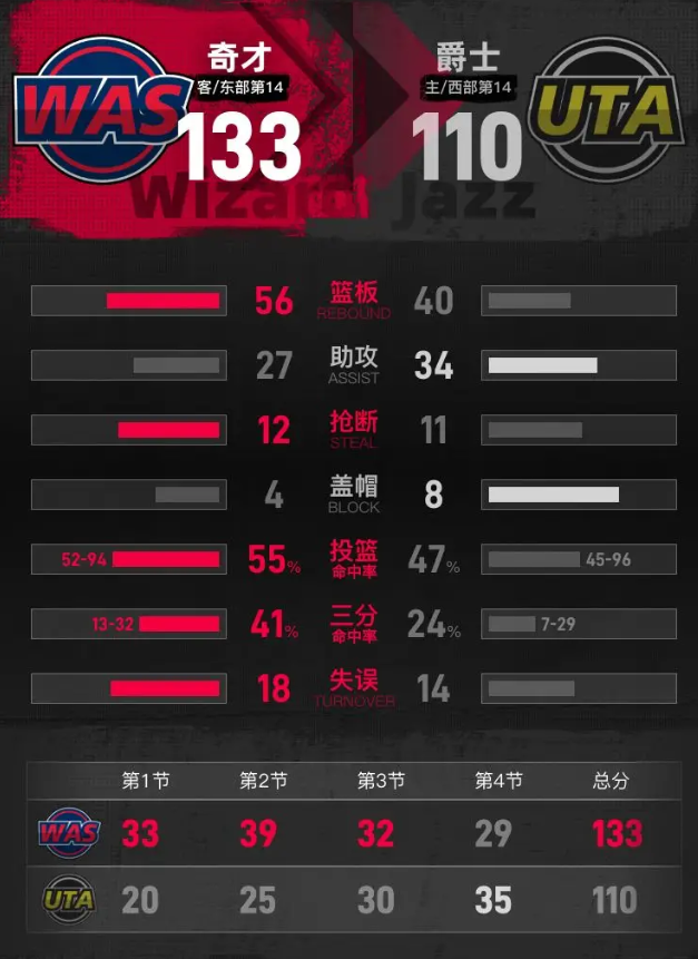 北京时间3月26日NBA常规赛,客场作战的奇才以133-110击败爵士,爵士遭遇3连败。里斯26分17篮板0助攻,威廉姆斯24分4篮板1助攻。