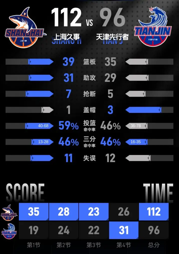 半场战罢,上海久事保持20分领先,进攻端多点开花,天津先行者始终未能将分差缩小到10分以内。
