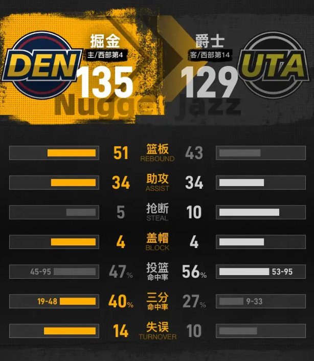 北京时间3月28日NBA常规赛,主场作战的掘金以135-129击败爵士,掘金取得5连胜,爵士遭遇4连败。约基奇33分15篮板12助攻,菲利波夫斯基25分8篮板5助攻。