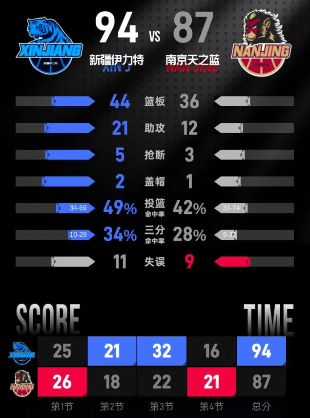 新疆伊力特队:伊力福拉提·莫合坦尔18分3篮板、杨芮16分2篮板、阿不都沙拉木·阿不都热西提16分8篮板6助攻、戴德里克·劳森12分6篮板3助攻、丹尼尔·布伊11分2篮板4助攻、齐麟9分2篮板、冯傲5分2篮板2助攻、扎卡里·纳托尔4分8篮板6助攻、塞缪尔·门内加2分3篮板、李炎哲1分2篮板、曲笑宇2篮板。