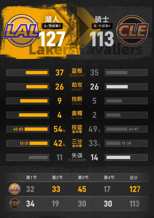 全场具体比分(湖人队在后):34-32、19-33、30-45、30-17。