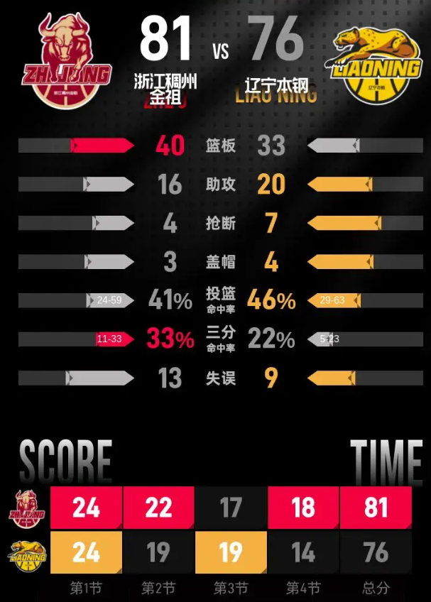 辽宁本钢队:付豪20分8篮板、泰勒·哈维13分1篮板1助攻、埃里克·莫兰德10分6篮板3助攻、德兹明·威尔斯9分1篮板1助攻、艾泽亚·布罗金顿8分1篮板、赵继伟6分4篮板13助攻、王岚嵚4分2篮板1助攻、张陈治锋3分1篮板、李晓旭3分1篮板1助攻、鄢手骐4篮板、姜宇星1篮板。