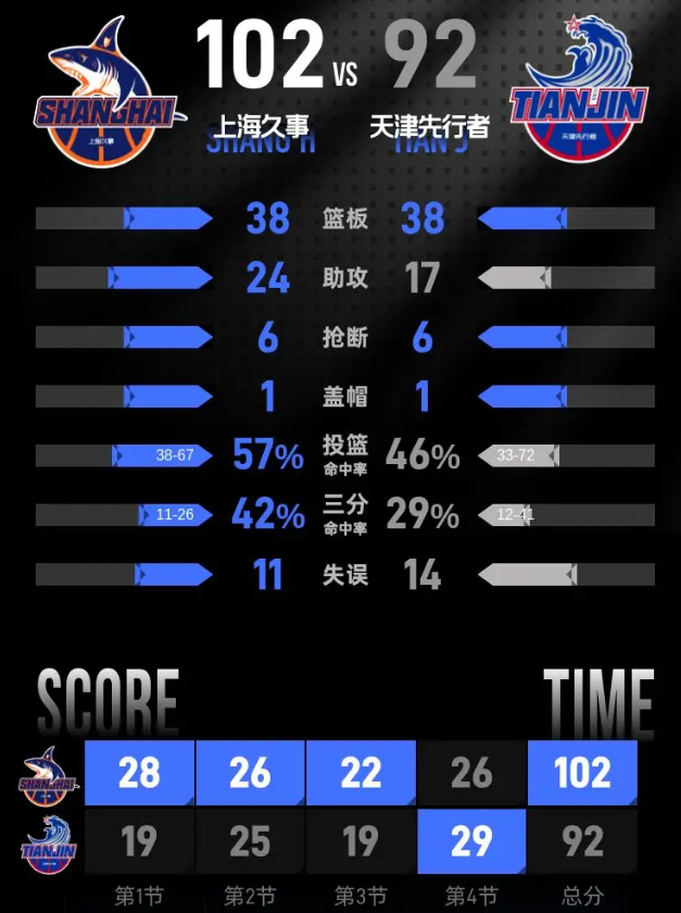 比赛进入末节,李弘权开局就命中三分,林庭谦上篮得分,王哲林上篮得分,林庭谦三罚全中,郑昊燃投进三分,李弘权立刻回敬三分。王哲林完成灌篮,谷泽浴上篮得分,林庭谦再上进篮,王哲林再添两分,古德温罚中一分,谷泽浴投进三分,李弘权上篮得分,郑昊燃勾手得分,张镇麟上篮,李弘权再中三分,分差回到16分。林庭谦命中三分,郑昊燃连得3分,怀特塞德灌篮得分,田雨回敬三分,怀特塞德再上篮得分,郑昊燃命中三分将分差缩小到8分,偰李永炜上篮得分,上海久事102-92击败天津先行者。