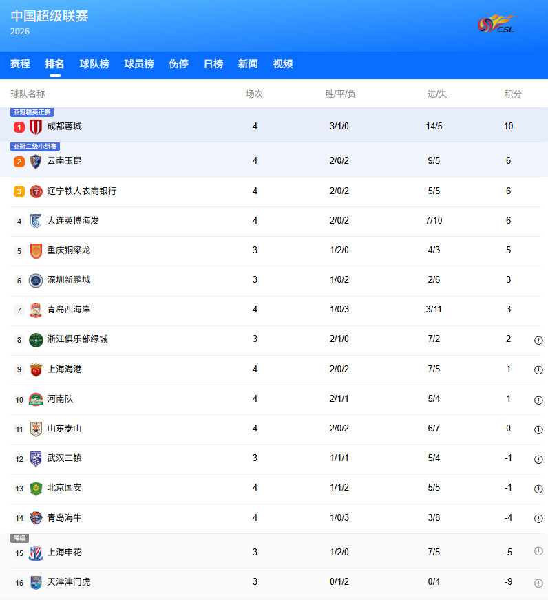 射手榜方面,成都蓉城的韦林顿和费利佩持续发力,均已攻入4球,其中韦林顿暂居榜首,费利佩紧随其后,成为本赛季最具威胁的射手之一。随着联赛的深入,各队积分争夺愈加激烈,未来的排名变化令人期待。