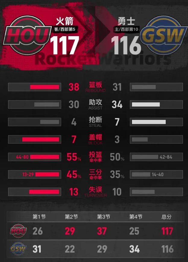 比赛进入末节,火箭稳步扩大优势,谢泼德命中三分后,领先优势来到14分。勇士不甘落败发起反扑,梅尔顿连中两记三分,库里也投进三分,佩顿二世连续快攻得分,分差很快缩小到2分。杜兰特回敬三分稳住局势,申京加罚命中后,火箭领先4分。库里最后57秒命中三分,佩顿二世篮下打进后,勇士116-115反超比分。最后11秒,申京接杜兰特助攻切入上篮命中反超比分,最终火箭117-116客场击败勇士,拿到胜利。
