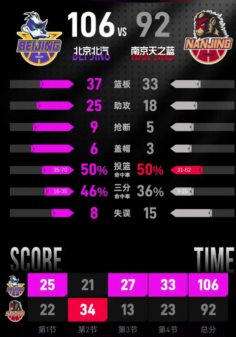比赛进入末节,北京开局连续得分,麦基灌篮得手,翟晓川篮下打进,很快将分差拉开到12分。马内克命中三分稳住局势,南京依靠郭昊文和赵柏清的连续得分,一度将分差缩小到4分。杰曼和雷蒙接连命中得分,重新拉开分差。最后两分钟陈盈骏命中三分,雷蒙再中三分,分差来到12分。最后阶段翟晓川命中三分,马内克回敬三分,比分定格在106-92,北京北汽主场收获胜利。