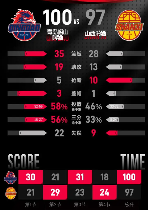 青岛崂山啤酒队:奎因达里·韦瑟斯庞35分6篮板6助攻、吕俊虎19分10篮板4助攻、乔丹·米奇17分11篮板3助攻、王睿泽14分1篮板3助攻、段昂君7分2篮板2助攻、约瑟夫·杨5分1篮板1助攻、赵嘉义3分。