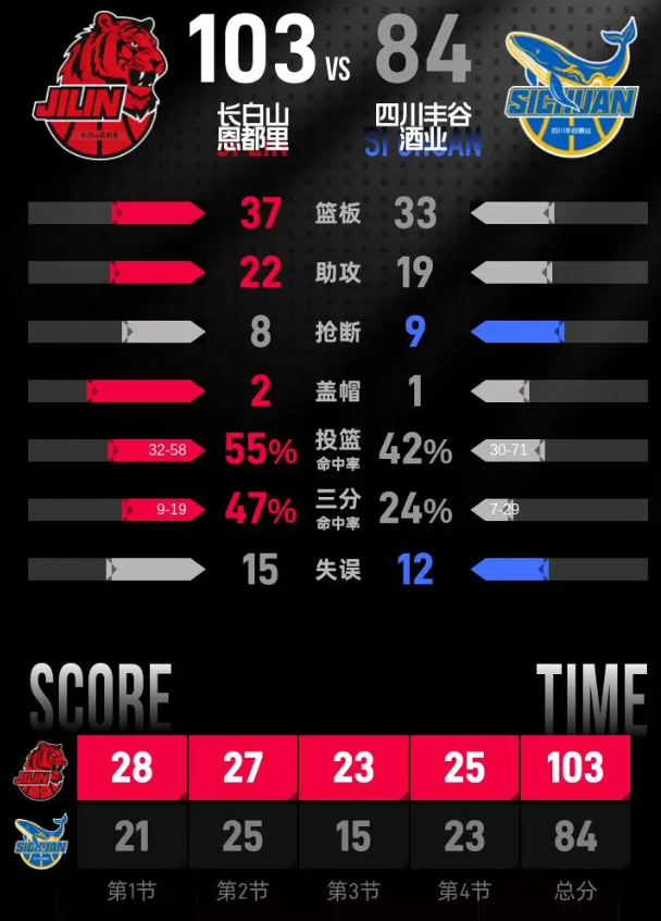 比赛进入末节争夺,景菡一率先命中三分,段立谦两罚全中,威尔逊上篮得分扩大优势。维纳莱斯回敬上篮,威尔逊再中三分,两次罚篮全中后分差已经拉大到23分。四川连续进攻得手,于枭永接连得分,景菡一两罚全中把分差缩小到19分,贾昊投进三分,段立谦多次罚中稳住主队优势。比赛最后一分钟,张航源接助攻上篮得手,主队拿到第103分,终场前杜智博接助攻上篮得分,长白山恩都里以103-84击败四川丰谷酒业。